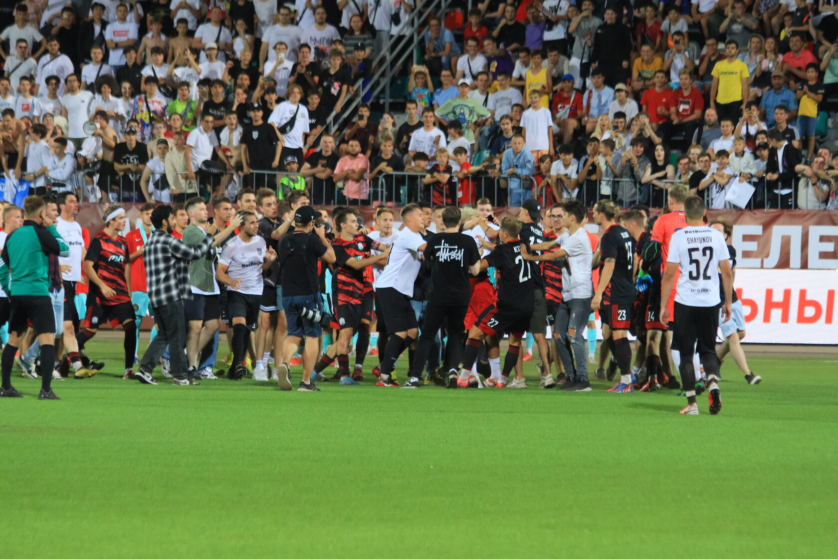 После пробития последнего пенальти, который вывел «поломанных» в финал, «Райзен», второй руководитель «Броуков» побежал в сторону трибун «Амкала» и начал демонстрировать все свое воспитание и уровень развития, показывая болельщикам команды неприличные жесты. Маврин начал отталкивать оппонента – в следствии чего, очередная потасовка.